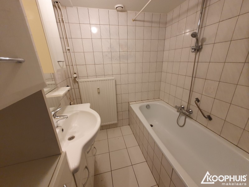 De badkamer is voorzien van een ligbad , een wastafel met ombouw en de aansluiting voor de wasmachine.